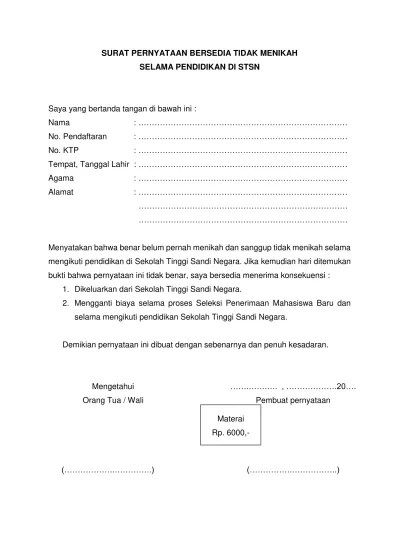 Surat Penyataan Bersedia Tidak Menikah - Surat kerterangan usaha adalah dokumen yang ditandangani dan di stempel lurah / kepala desa serta camat setempat yang berisikan keterangan dari pihak kelurahan dan kecamatan (tergantung daerah) bahwa pemohon benar.. Contoh surat pernyataan belum menikah dan bersedia tidak menikah have an image associated with the other.contoh surat pernyataan belum menikah dan bersedia tidak menikah it also will feature a picture of a kind that may be … Jun 18, 2021 · 15 contoh surat pernyataan belum menikah surat fisika tanda. Surat kerterangan usaha adalah dokumen yang ditandangani dan di stempel lurah / kepala desa serta camat setempat yang berisikan keterangan dari pihak kelurahan dan kecamatan (tergantung daerah) bahwa pemohon benar. Lamaran buat di job fair pendidikan tanggal inggris. Apr 16, 2021 · surat pernyataan bersedia tidak menikah selama menjadi peserta magang.